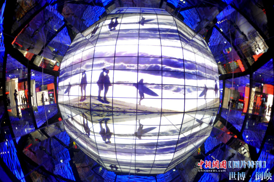 上海世博園內(nèi)的巴塞羅那城市案例館,方形屏幕在周圍玻璃的倒映下形成球形視覺。中新社記者 廖攀 攝