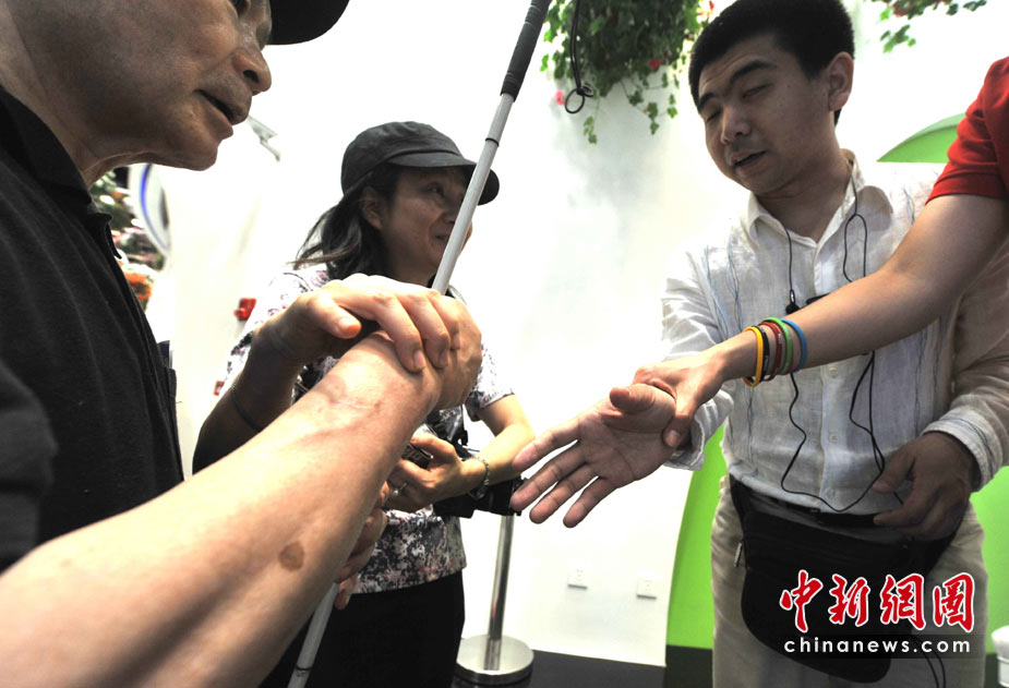5月4日是上海世博會(huì)第四天,盲人鋼琴家孫巖在生命陽(yáng)光館專設(shè)區(qū)域?yàn)楸姸鄽埣踩撕陀^眾演奏,導(dǎo)盲犬靜臥在他的腳邊,這是世博會(huì)歷史上第一次為殘疾人設(shè)館。孫巖2005年獲得“日本橫濱第一屆國(guó)際殘疾人鋼琴比賽”金獎(jiǎng),他是中央音樂(lè)學(xué)院有史以來(lái)第一位盲人大學(xué)生和研究生。他的傾情演奏感動(dòng)全場(chǎng),掌聲連連。一位日本盲人參觀者激動(dòng)地上前致敬。 中新社發(fā) 賈國(guó)榮 攝