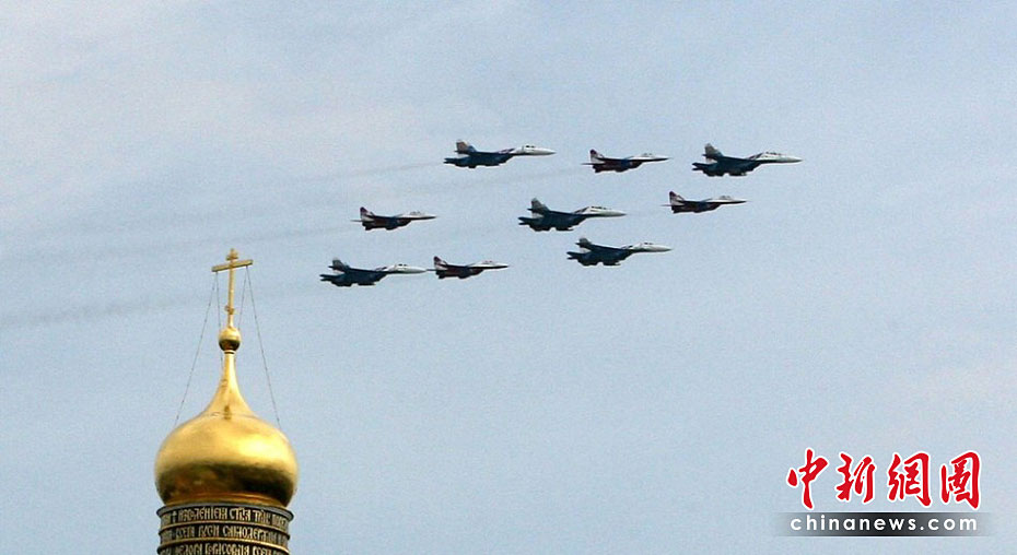 當(dāng)?shù)貢r(shí)間5月4日,在俄羅斯首都莫斯科,參加彩排的戰(zhàn)機(jī)編隊(duì)飛過紅場(chǎng)上空。俄羅斯將于5月9日隆重紀(jì)念衛(wèi)國戰(zhàn)爭(zhēng)勝利65周年。圖片來源:中國新聞網(wǎng)