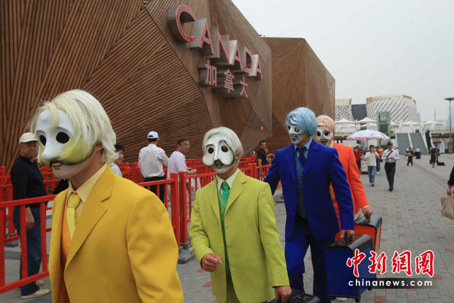 5月6日,幾位穿著艷麗服裝的“藝術(shù)家”,走進(jìn)世博會(huì)加拿大館,這是加拿大館的文化推廣內(nèi)容之一。中新社發(fā) 潘索菲 攝