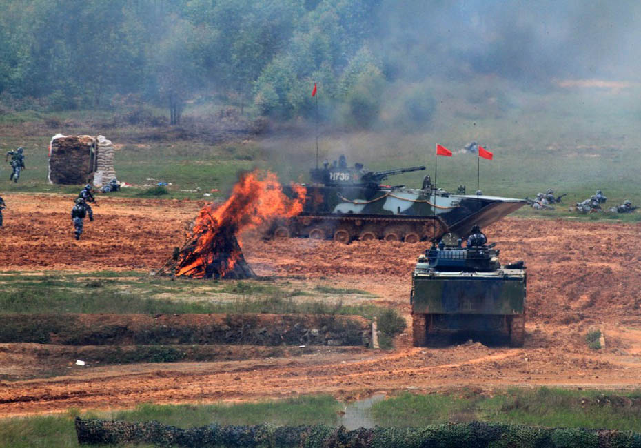海軍陸戰(zhàn)隊(duì)在訓(xùn)練場進(jìn)行登陸作戰(zhàn)實(shí)兵實(shí)彈演練。圖片來源:新華網(wǎng) 查春明攝