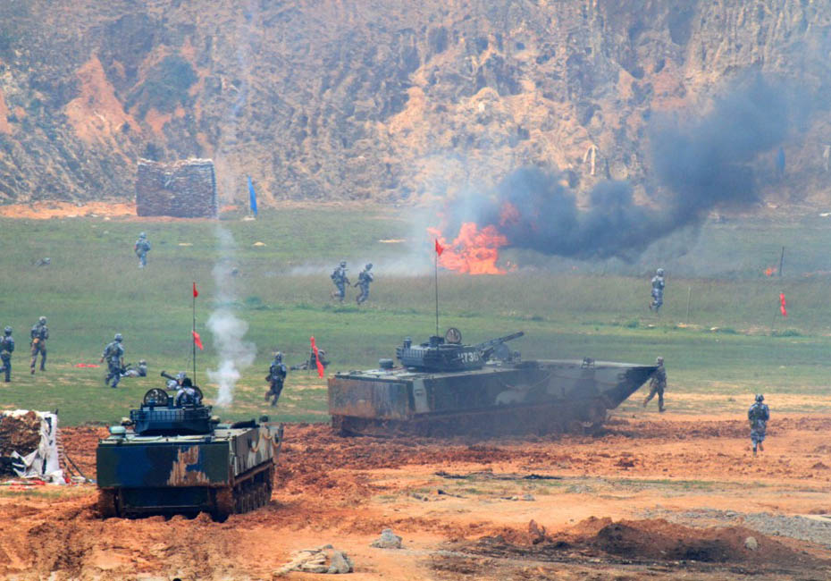 5月5日,海軍陸戰(zhàn)隊(duì)在訓(xùn)練場進(jìn)行登陸作戰(zhàn)實(shí)兵實(shí)彈演練。圖片來源:新華網(wǎng) 查春明攝