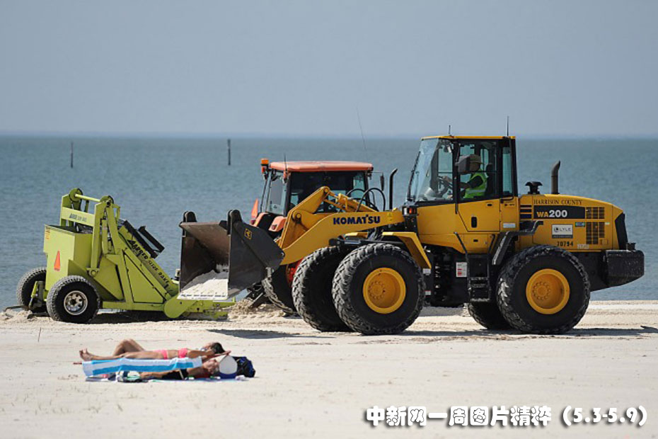 5月4日周二,在美國密西西比州加爾波特的一處海灘上,人們?cè)谙硎苋展庠,根本不理?huì)旁邊駛過的重型機(jī)械車。