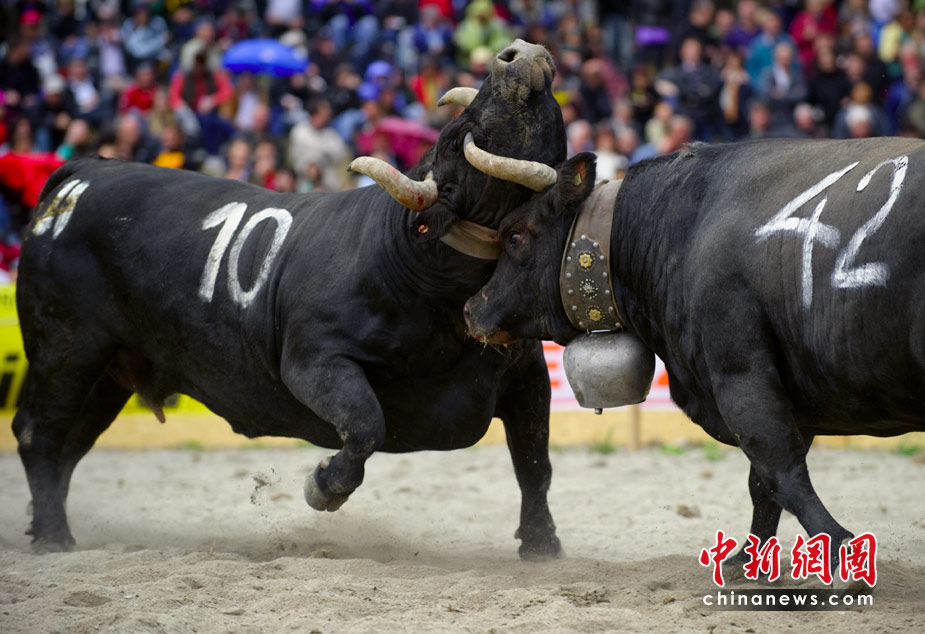 5月9日,在瑞士瓦萊州舉行了一年一度的斗奶牛大賽。這項(xiàng)發(fā)起于1923年的賽事是為了挑選牛群中最強(qiáng)壯的“奶;屎蟆薄