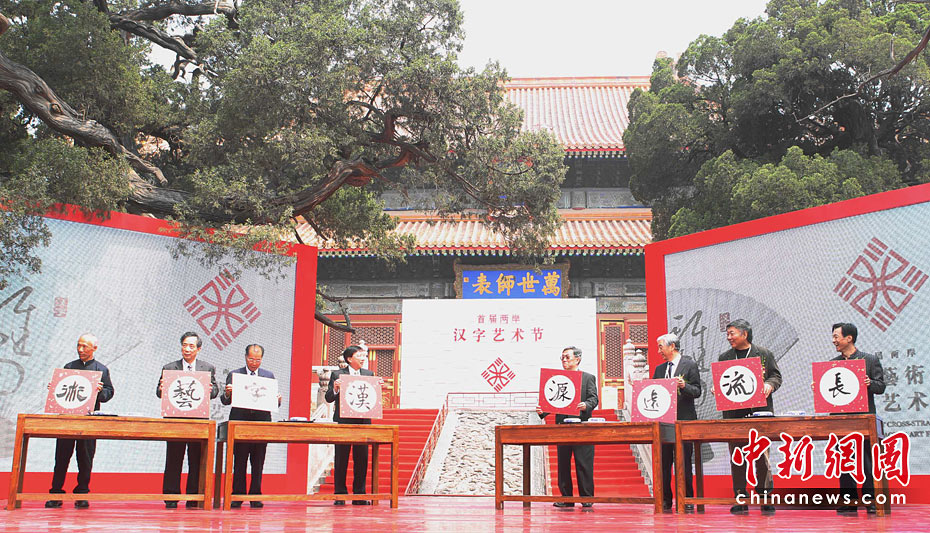 5月15日,首屆“兩岸漢字藝術(shù)節(jié)”新聞發(fā)布會在北京孔廟舉行。原文化部長、著名作家王蒙與臺灣文化總會會長劉兆玄等共同書寫漢字——“漢字藝術(shù)源遠流長”。 中新社發(fā) 蘇丹 攝