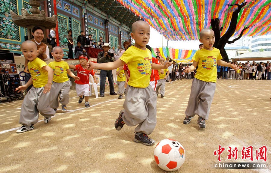 2010年5月15日,韓國(guó)首爾曹溪寺院舉行了兒童足球賽,一群四五歲的孩子和小和尚參加了這場(chǎng)足球友誼賽。這場(chǎng)比賽是佛誕節(jié)活動(dòng)的一部分,也是為了迎接2010世界杯足球賽的到來(lái)。Chung Sung-Jun