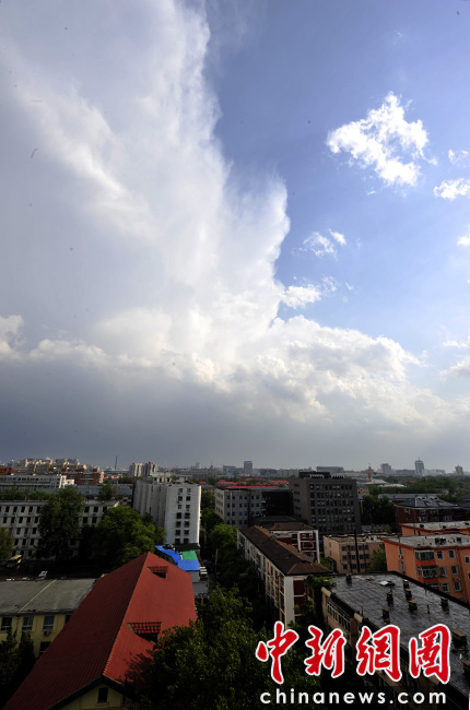 5月18日16時許,伴隨陣陣?yán)茁暰┏峭唤荡笥辏涤赀^后東部天空依然籠罩著烏云,而西邊卻已放晴。中新網(wǎng)記者 金碩 攝