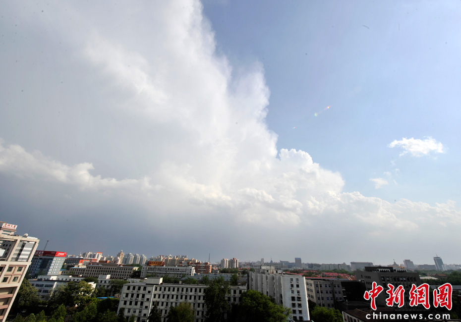 5月18日16時許,伴隨陣陣雷聲京城突降大雨,降雨過后東部天空依然籠罩著烏云,而西邊卻已放晴。中新網記者 金碩 攝