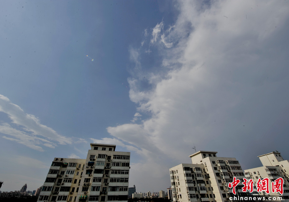 5月18日16時許,伴隨陣陣?yán)茁暰┏峭唤荡笥,降雨過后東部天空依然籠罩著烏云,而西邊卻已放晴。中新網(wǎng)記者 金碩 攝
