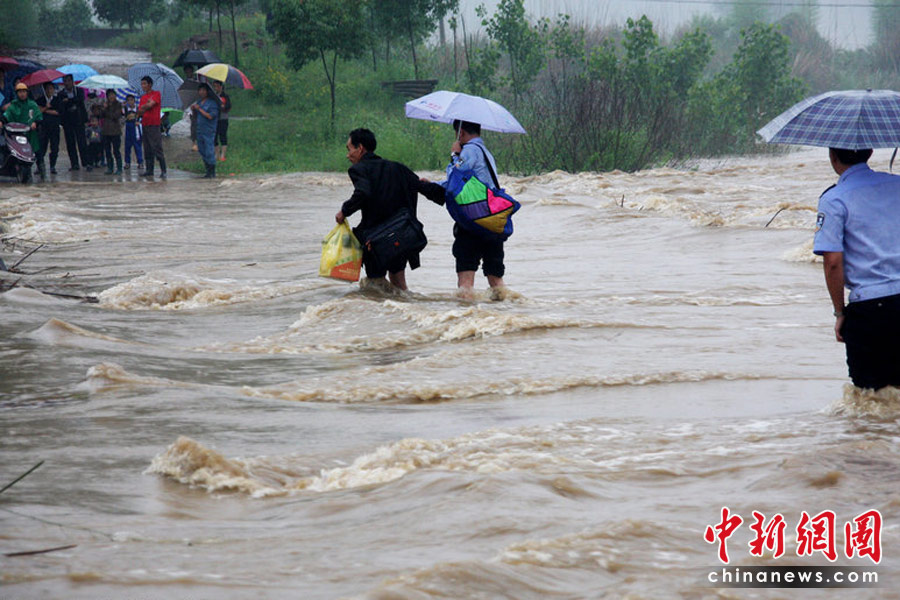 2010年5月18日,江西省婺源縣太白鎮(zhèn)朱村村民在當(dāng)?shù)毓哺删淖o(hù)送下通過被淹公路橋。當(dāng)日,江西全省近50個(gè)縣出現(xiàn)普降暴雨,其中婺源縣、 降雨量以婺源縣153毫米為最大,當(dāng)?shù)匾丫o急轉(zhuǎn)移群眾4000余人。到筆者發(fā)稿止,在該縣太白鎮(zhèn)通往德興市的主要公路被迫中斷,樂安河太白段水位均已超出警界線。卓忠偉/CFP