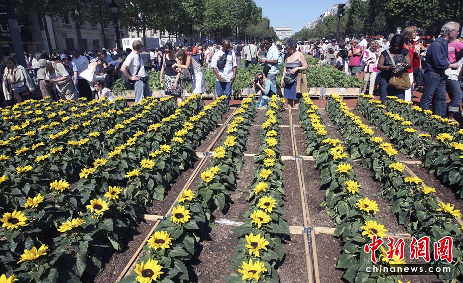5月24日,法國總統(tǒng)薩科齊和妻子布呂尼參觀在法國巴黎舉行的“自然首都”展。該項(xiàng)展覽是由街頭藝術(shù)家加德·魏爾聯(lián)手法國“青年農(nóng)民協(xié)會”和林業(yè)協(xié)會共同發(fā)起的的,將百余種農(nóng)作物、樹木和動(dòng)物“齊聚”法國首都巴黎的香榭麗舍大街,令這條“香街”變身“綠色的自然世界”。圖片來源:中國新聞網(wǎng)