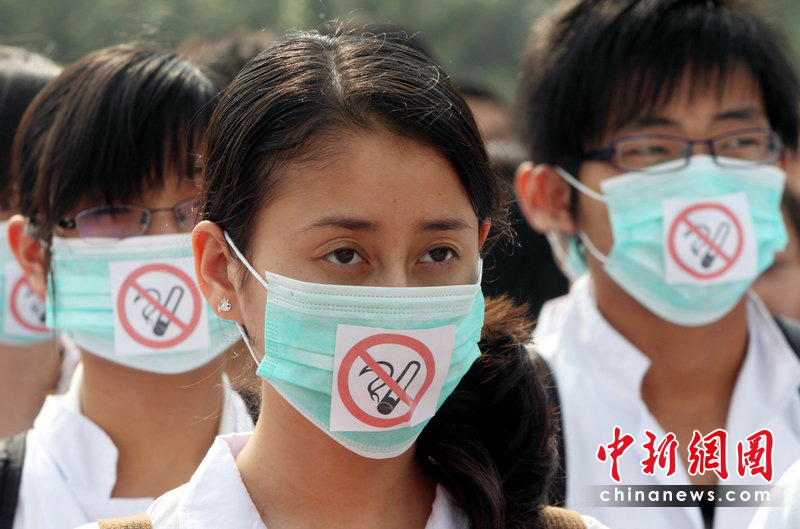 5月31日是第23個“世界無煙日”,今年的主題是:性別與煙草——抵制針對女性的市場營銷。吸煙有害健康早已成為不爭的事實。有關(guān)醫(yī)學(xué)研究表明,吸煙可導(dǎo)致心腦血管疾病、癌癥、慢性阻塞性肺病等多種疾病,已成為繼高血壓之后的全球第二號殺手。為了您的健康,請熄滅您手中的香煙。圖為5月29日西安大學(xué)生戴著無煙口罩開展控?zé)熜袆。袁景?攝