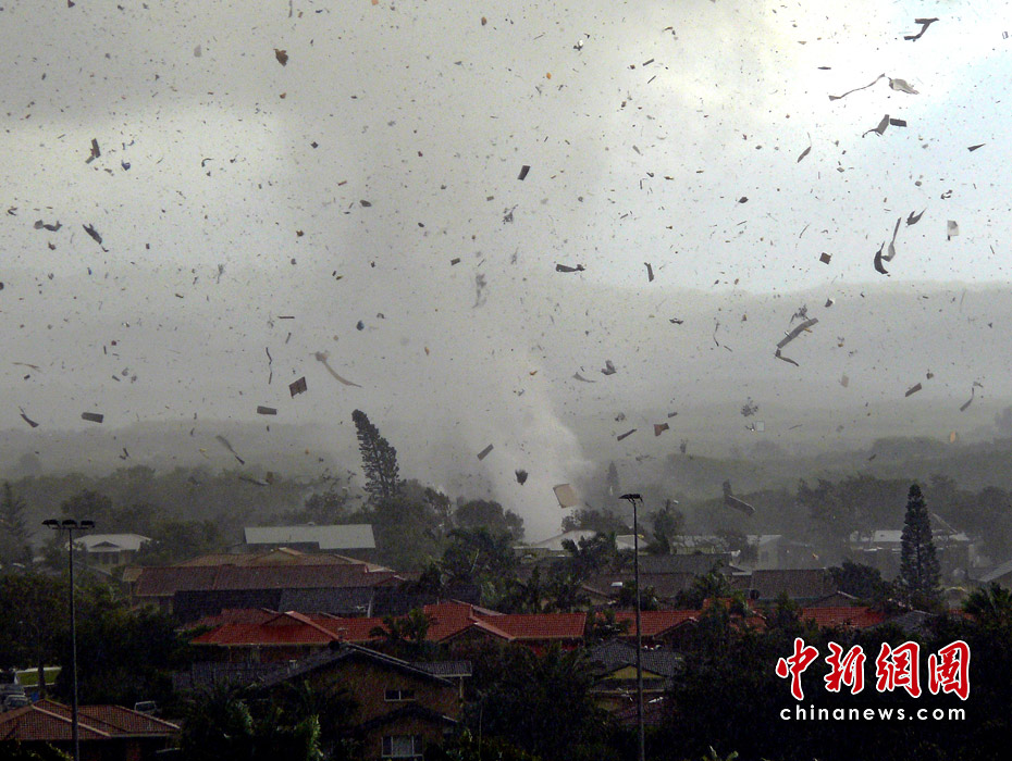6月3日,澳大利亞新南威爾士州海濱城鎮(zhèn)倫諾克斯黑德遭到龍卷風(fēng)襲擊,大樹被連根拔起,屋頂被掀翻,重型拖車也被拋到半空中。數(shù)千所民居停電。一共有12所房屋在這場龍卷風(fēng)中被摧毀,6人受傷,傷勢不重。所幸沒有人員死亡的報告。圖片來源:中國新聞網(wǎng)
