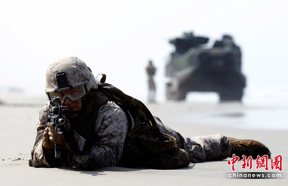 當?shù)貢r間6月4日,約5000名水兵和陸戰(zhàn)隊員在美國加利福尼亞州舉行了代號為“黎明突擊”的搶灘登陸軍事演習(xí)。圖片來源:中國新聞網(wǎng)
