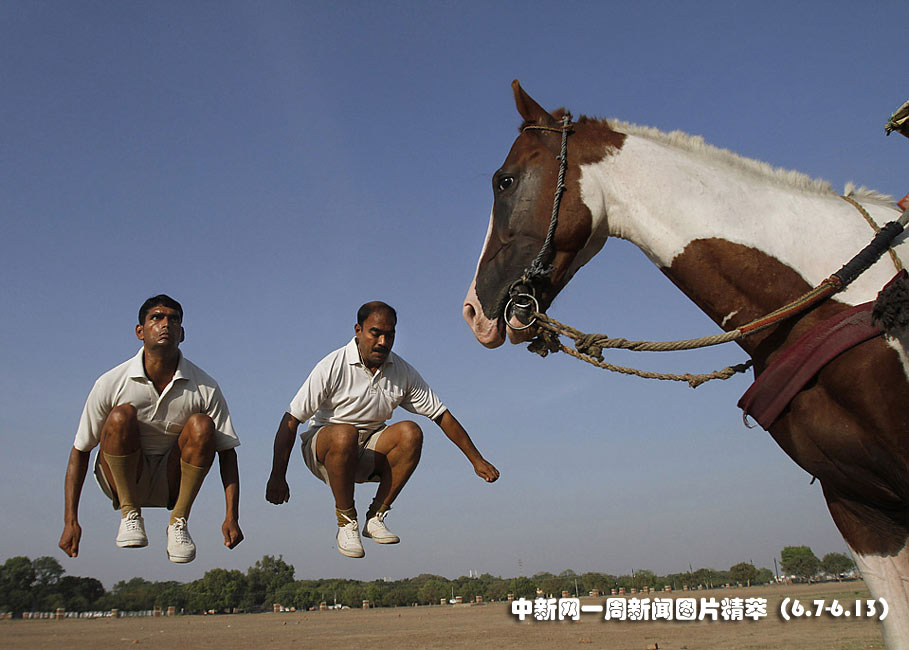 周三(9日),在印度阿拉哈巴德,警察正在做練習,此時一匹馬正好經過。