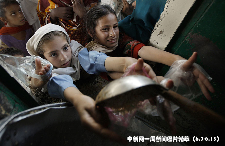 周四(10日),在巴基斯坦伊斯蘭堡的Sufi shrine Beri Iman食品分發(fā)中心,孩子們手托塑料袋接收捐贈(zèng)的大米。