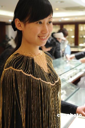 3月10日,在濟南泉城路一家金店,店員向顧客展示一款價值29.8萬元的金質(zhì)披肩。據(jù)店方介紹,這款披肩在國內(nèi)首度亮相,采用18k金機織而成,設計獨特,十足珍貴。中新社發(fā) 羅波 攝