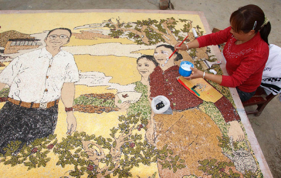 溫家寶總理兩度探望的四川大地震極重災(zāi)區(qū)青川縣黃坪鄉(xiāng),村民正用五谷雜糧制作大型粘貼畫:“總理來到棗樹村”,藝術(shù)性再現(xiàn)他親臨棗樹村關(guān)心慰問鄉(xiāng)民的情景。該畫高1.83米,寬3.05米,以木板為底,畫面色彩全部用當?shù)厥a(chǎn)的玉米、黃豆、小豆、黑豆、蕎麥等二十多種雜糧拼貼,表達了村民與國家領(lǐng)導(dǎo)人的真摯樸實感情。中新社發(fā) 沈若飛 攝