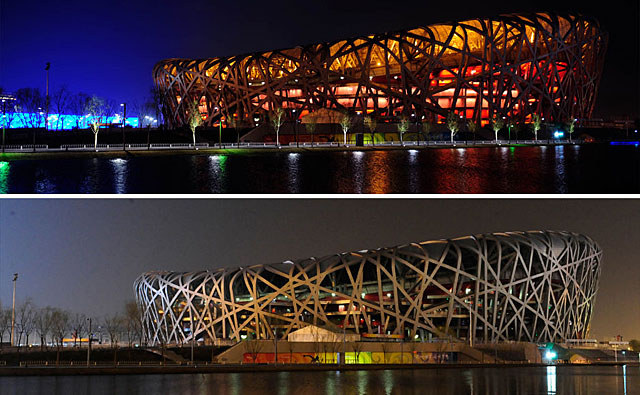中國北京。3月28日,熄燈前后的國家體育場(chǎng)“鳥巢”。