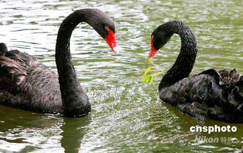 6月13日,一對黑天鵝在蘇州動(dòng)物園池塘水面上結(jié)伴游弋。初夏時(shí)節(jié),氣溫漸暖,蘇州動(dòng)物園里的黑天鵝們紛紛成雙結(jié)對,戲水游弋。中新社發(fā) 蘇秀 攝