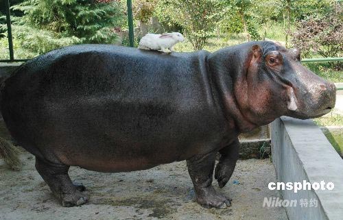 7月6日,在浙江省溫嶺動(dòng)物園里,巨大的河馬背上趴著一只小白兔,它們一起走動(dòng)覓食、納涼消夏,讓游客忍俊不禁。中新社發(fā) 江勇兵 攝