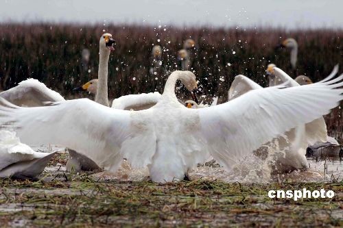 2008年11月15日,數(shù)千只大天鵝陸續(xù)飛抵江西九江縣東湖棲息覓食。由于鄱陽湖水位上漲,以及當?shù)丨h(huán)境適宜等原因,大量國家二級保護動物天鵝前來越冬。中新社發(fā) 張 俊 攝
