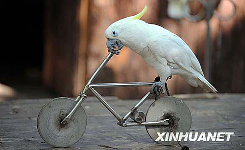 11月18日,一只鸚鵡在野象谷景區(qū)表演騎自行車。
