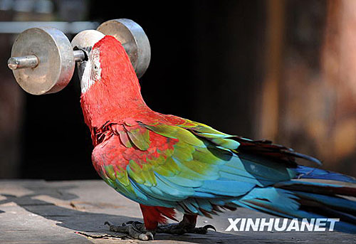11月18日,一只鸚鵡在野象谷景區(qū)表演用嘴舉“杠鈴”。