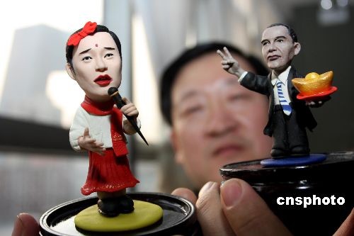 2月8日,北京朝陽(yáng)區(qū)文化館,非物質(zhì)文化遺產(chǎn)項(xiàng)目傳承人“面人彭”彭小平,展示他精心制作的面人新作品——小沈陽(yáng)和奧巴馬。當(dāng)日,為迎接正月十五元宵節(jié),朝陽(yáng)區(qū)文化館舉辦非物質(zhì)文化遺產(chǎn)手工藝作品交流活動(dòng),10余位民間藝術(shù)家進(jìn)行現(xiàn)場(chǎng)技藝展示。中新社發(fā) 鄭雄增 攝