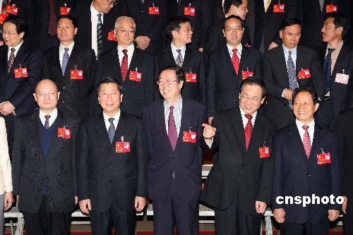 十月十九日,出席中共十七大的中央金融系統(tǒng)代表在駐地合影留念。前排從左至右為國家開發(fā)銀行行長陳元、證監(jiān)會(huì)主席尚福林、中國人民銀行行長周小川、銀監(jiān)會(huì)主席劉明康、保監(jiān)會(huì)主席吳定富。中新社發(fā) 毛建軍 攝