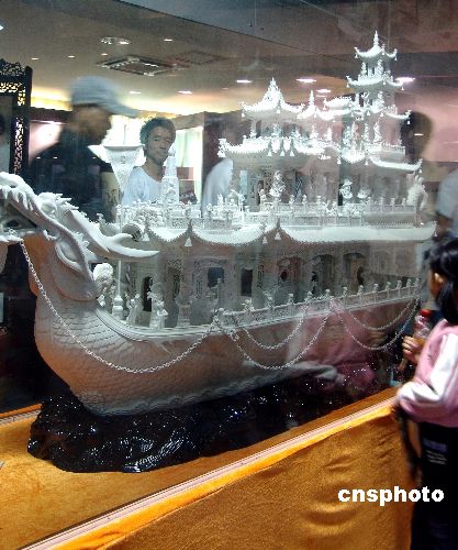 10月20日,2007景德鎮(zhèn)國(guó)際陶瓷博覽會(huì)上展出的《奧運(yùn)盛會(huì)》巨型瓷雕龍船。該船由江西景德鎮(zhèn)工藝美術(shù)師劉松林用6年多時(shí)間潛心創(chuàng)作并成功燒制的。船長(zhǎng)2.08米、高1.16米、寬0.5米,五層樓閣的龍船上有42個(gè)運(yùn)動(dòng)項(xiàng)目的88位運(yùn)動(dòng)員造型,欄桿上刻有奧運(yùn)五環(huán)和國(guó)旗。中新社發(fā) 石衛(wèi)明 攝