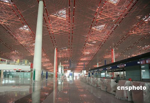 2007年11月6日,被尊稱“國門工程”的2008年北京奧運會項目——首都機場三號航站樓工程露出廬山真面目,內(nèi)部精裝修、機電設備、信息系統(tǒng)等項目基本完工,近日進行驗收。首都機場三號航站樓是北京2008年奧運會項目,該航站樓總建筑面積90.2萬平方米,長2900米,寬790米,建筑高度45米,由T3A主樓、T3B國際候機指廊、T3C國際候機指廊組成,其中三號航站樓主樓建筑面積達55萬平方米,是國內(nèi)目前最大的單體建筑。中新社發(fā) 洪濤 攝