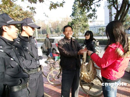 11月27日早晨,襄樊下崗工人王明浩在路上撿到一個(gè)女包,包里有1800多元現(xiàn)金和存有1萬(wàn)多元的銀行卡,他隨即通過(guò)110巡警找到失主,并將錢物完好交還。據(jù)了解,2007年45歲的王明浩,是原襄樊萬(wàn)山陶瓷廠下崗職工,下崗后他主要靠在市區(qū)建筑工地打工,每月收入約600元。 中新社發(fā) 李得榮 攝