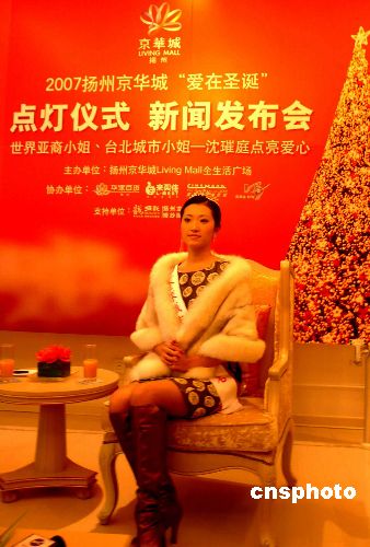 11月30日,揚州舉辦“愛在圣誕”點燈儀式及中國麥田計劃獻(xiàn)愛心新聞發(fā)布會。世界亞裔小姐、臺北城市小姐沈璀庭出席,并將于12月1日晚在揚州京華城廣場為21米高的巨型圣誕樹啟動“愛在圣誕”點燈儀式,并與“中國麥田計劃”愛心慈善團(tuán)體攜手獻(xiàn)愛心!爸袊溙镉媱潯庇2005年成立,是一個為貧困地區(qū)兒童建立圖書室、捐贈衣物及創(chuàng)造讀書機會的民間志愿組織。中新社發(fā) 崔佳明 攝