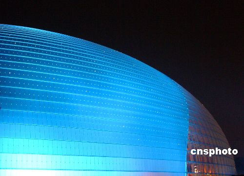 12月30日晚,北京國(guó)家大劇院四周燈光閃爍,夜色璀璨,蔚藍(lán)色的國(guó)家大劇院在夜幕中顯得美麗迷人。當(dāng)晚,有關(guān)人員在調(diào)試燈光,以迎接12月31日在這里舉行的2008年新年音樂會(huì)。中新社發(fā) 玉龍 攝