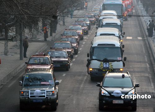 一月七日,新疆烏魯木齊,三千余輛出租車自發(fā)組成車隊(duì)浩浩蕩蕩為烈士送行。當(dāng)日,在撲滅“1.2”烏魯木齊德匯國際廣場(chǎng)大火中犧牲的三位消防官兵追悼會(huì)在該市殯儀館舉行,新疆各界人士及三千余輛出租車、萬余市民自發(fā)為三位烈士送別。中國公安部已批準(zhǔn)壯烈犧牲的烏魯木齊消防支隊(duì)官兵朱曉雷、張宇、高峰三人為“革命烈士”。中新社發(fā) 劉新 攝