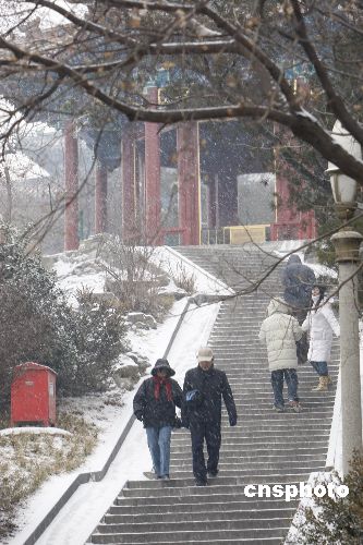 1月17日,北京景山公園的游人踏雪游玩,興致不減。當(dāng)日,北京迎來了2008年的第一場(chǎng)降雪,伴著寒風(fēng),小雪很快灑滿了京城的大街小巷。中新社發(fā) 杜洋 攝