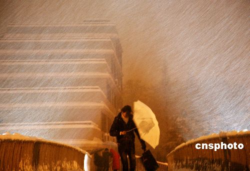 1月27日晚,行人在紛飛的大雪中和被積雪覆蓋的道路上艱難的行走。當(dāng)晚,江蘇省南京市再次出現(xiàn)中到大雪的降雪過(guò)程,部分地區(qū)降雪量達(dá)10毫米以上,局部地區(qū)出現(xiàn)暴雪,江蘇省氣象臺(tái)在當(dāng)晚18時(shí)20分首次將暴雪黃色預(yù)警變更為暴雪橙色預(yù)警,提醒相關(guān)部門和市民做好防雪災(zāi)、防凍害和道路清掃、積雪融化工作。中新社發(fā) 鐘山 攝