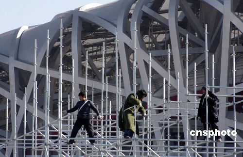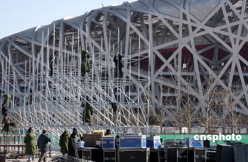 2月1日,工人在北京“鳥巢”奧運(yùn)工地搭設(shè)晚會(huì)舞臺(tái),迎接大年三十晚會(huì)到來。據(jù)了解,今年春節(jié)“鳥巢”工地將有五六百名工人堅(jiān)守在各自崗位上,這場(chǎng)晚會(huì)專門為他們準(zhǔn)備的。中新社發(fā) 吳芒子 攝