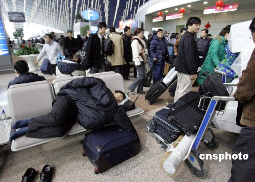 2月2日,上海再遇暴雪,浦東國際機場春運工作受到嚴重影響。僅2月1日,上海虹橋、浦東兩機場共延誤二百多個航班,取消十多個航班。圖為一位旅客在候機大廳酣睡。中新社發(fā) 潘索菲 攝