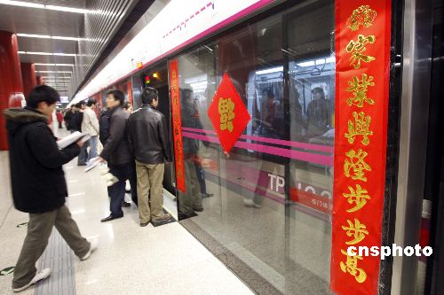 圖:春聯(lián)貼進(jìn)北京地鐵 乘客坐車猶如過年
