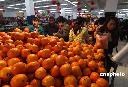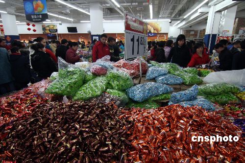 2月4日,婁底市民在超市選購年貨。近日湖南婁底市遭受了50年一遇的冰凍災害,全市95個鄉(xiāng)鎮(zhèn)不同程度受災,倒塌房屋15337間,緊急轉移安置11282人,因災摔死2人,農(nóng)作物受災面積108.71畝,當?shù)馗咚俟、國道、省道在冰凍期間不暢通。在抗冰雪凍災中,婁底市迅速采取應對措施,市民及各企業(yè)單位共同參與,將冰凍災害損失降到最低限度。隨著春節(jié)來臨,婁底市節(jié)日市場購銷兩旺、貨足價穩(wěn),市民們紛紛忙于采買年貨。中新社發(fā) 郭國權 攝