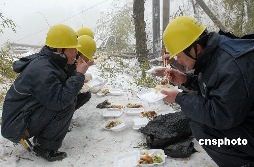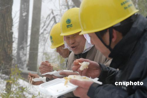 2月6日下午1點,新昌城關(guān)供電營業(yè)所城區(qū)供電服務(wù)班班長梁雍和他的隊員們一起在施工現(xiàn)場吃中飯。當(dāng)日,浙江新昌縣供電局城關(guān)供電營業(yè)所的員工在該縣城南鄉(xiāng)搶修秦巖177線,目前,新昌有35個行政村因雪災(zāi)尚未通電,561名電力搶修隊員仍奮戰(zhàn)在搶修一線。據(jù)悉,電力工人們?yōu)樵缛胀姡暌癸堃仓荒茉谏缴铣粤。中新社發(fā) 袁云 攝