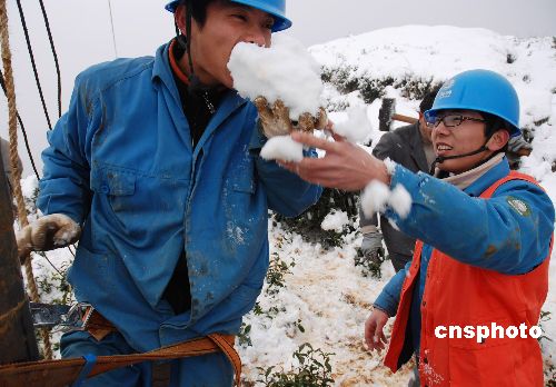 2月6日,電力搶修隊員在海撥600米的高山雪地里吃年夜飯。據(jù)悉,近日雪災(zāi)造成浙江嵊州21條主要供電線路中斷供電,該市供電局每天出動500余人進(jìn)行抗災(zāi)自救。2月6日,該市供電局200多名黨員干部組成6支電力搶修突擊隊員,對該市貴門、里南、長樂3個未通電鄉(xiāng)鎮(zhèn)開展春節(jié)供電大會戰(zhàn),當(dāng)晚6時前,該市全面修復(fù)供電,實現(xiàn)新春零斷電。中新社發(fā) 張亮宗 攝