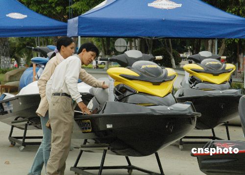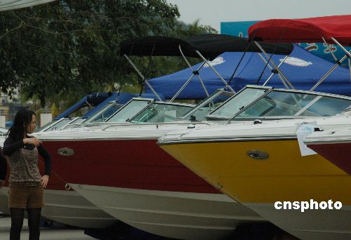 2月8日,游人在三亞鹿回頭廣場參觀豪華游艇。由三亞順業(yè)船舶設(shè)備有限公司和香港游艇廠商聯(lián)合舉辦的2008迎春游艇展覽會繼續(xù)在海南三亞鹿回頭廣場舉行,這是三亞首次舉行的大規(guī)模游艇展,展覽將持續(xù)到2月14日。所展出的圣斯克、夢特威、斯莎等品牌的豪華游艇、摩托艇、快艇以及加拿大龐巴迪品牌旗下的快艇、雪地車、沙灘車等海上運動休閑娛樂產(chǎn)品,春節(jié)期間吸引諸多三亞市民和游客參觀。中新社發(fā) 尹海明 攝