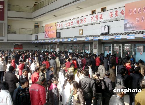 2月9日,蘇州火車站售票大廳內(nèi)擠滿了排隊(duì)預(yù)購(gòu)返程火車票的乘客。新的休假辦法的實(shí)行,春節(jié)后上班日期由以往的正月初八變更為初七,因此購(gòu)票高峰也提前到來。當(dāng)日,蘇州火車站售票大廳內(nèi)人潮涌動(dòng),許多旅客紛紛提前購(gòu)買返程火車票。中新社發(fā) 王建康 攝