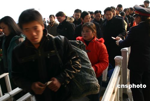 2008年2月11日,春節(jié)長(zhǎng)假接近尾聲,人們紛紛踏上返程路,有的回家,有的奔赴工作崗位。南京火車站因此迎來(lái)春節(jié)后的客流高峰。中新社發(fā) 阿董 攝