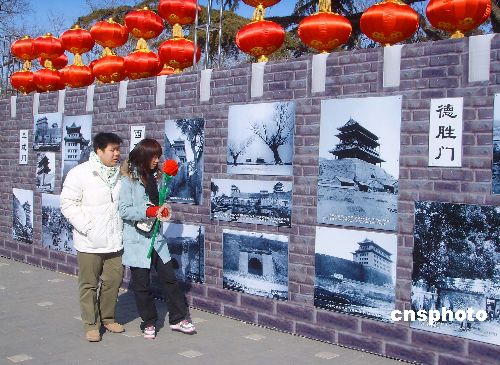 2月13日,北京龍?zhí)逗䦶R會(huì)舉辦的最后一天,園中展出的老城門照片吸引了眾多市民的目光。中新社發(fā) 玉龍 攝