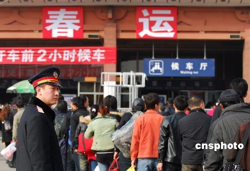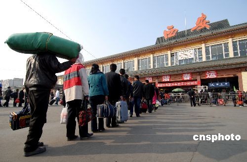2月19日,旅客在西安火車站排隊(duì)有序進(jìn)站乘車。元宵節(jié)將至,外出民工與返校學(xué)生流、探親流等客流全面啟動(dòng),西安火車站客流持續(xù)攀升。鐵路部門采取提前二小時(shí)進(jìn)站、在廣場(chǎng)設(shè)立臨時(shí)候車區(qū)等措施,做好旅客乘車組織及服務(wù)工作,確?土鞲叻灏踩、平穩(wěn)、有序。中新社發(fā) 唐振江 攝
