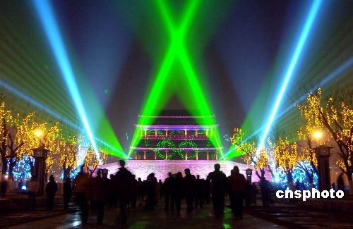 2月20日,北京永定門城樓開始為元宵燈會試燈,電腦激光燈在城樓上印出奧運(yùn)五環(huán)、“同一個世界 同一個夢想”、元宵節(jié)快樂等圖案和字樣。元宵節(jié)當(dāng)晚永定門城樓將上演一場絢麗的激光秀。中新社發(fā) 廖攀 攝